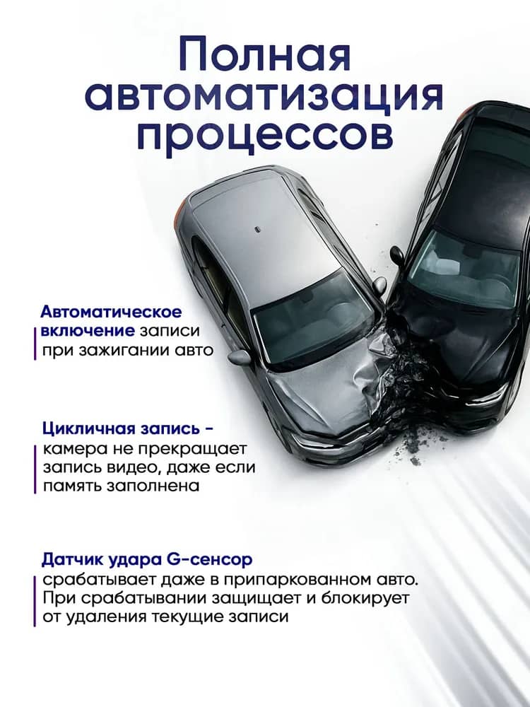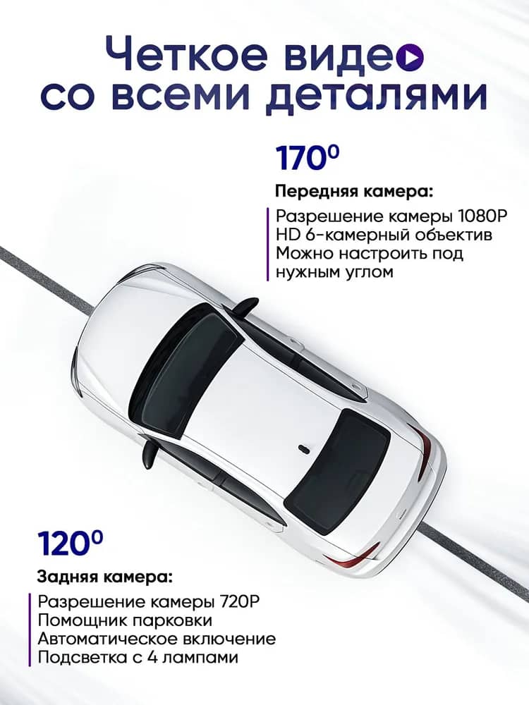 ● Двойная запись: Основная камера видеорегистратора и камера заднего вида работают синхронно, обеспечивая полный охват происходящего вокруг автомобиля.